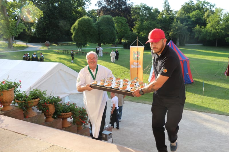 Was für ein Empfang: Kochbrüder, Gäste, Sponsoren und auch Schwägerinnen treten ein in ein wahrhaft kaiserliches Geschehen: Mittelalterliche Rundzelte, bewaffnete Ritter, die Kulisse im Park und auf der Freitreppe zu Schloss Herrnsheim einfach großartig – Mittelaltermarkt – ein einmaliges Erlebnis. Das Fanfarencorps der Nibelungenstadt Worms, perfekt, unterhält uns mit einem Standkonzert. Ein Bier- und ein Weinstand löschen den Durst.