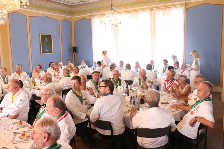 Hier besonders hervorzuheben muss man GMdC Wilfried Neudecker „Soßen Willi“, der ebenso wie LK GMdC Dr. Herbert Geipert, ganze Gänge vorbereitete. Wer glaubt, dass das schon alles ist, wird eines Besseren belehrt: Bernd ruft zum Eintreten in die Festräume, wieder sitzen Kapitel und Großkapitel in bunter Reihe mit Sponsoren und Kochbrüdern. Und hier werden für über 100 Personen 5 Gänge auf hohem Niveau, dazu Spitzenweine – darunter „Große Gewächse“ – organisiert von Chuchileiter Bruder Hans und gestiftet von regionalen Winzern perfekt serviert. Zusammen mit dem Schirmherren, Oberbürgermeister Michael Kissel, erlebten Brüder und Gäste neben dem fulminanten Menü ein buntes Programm.